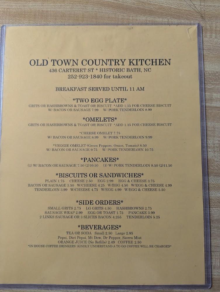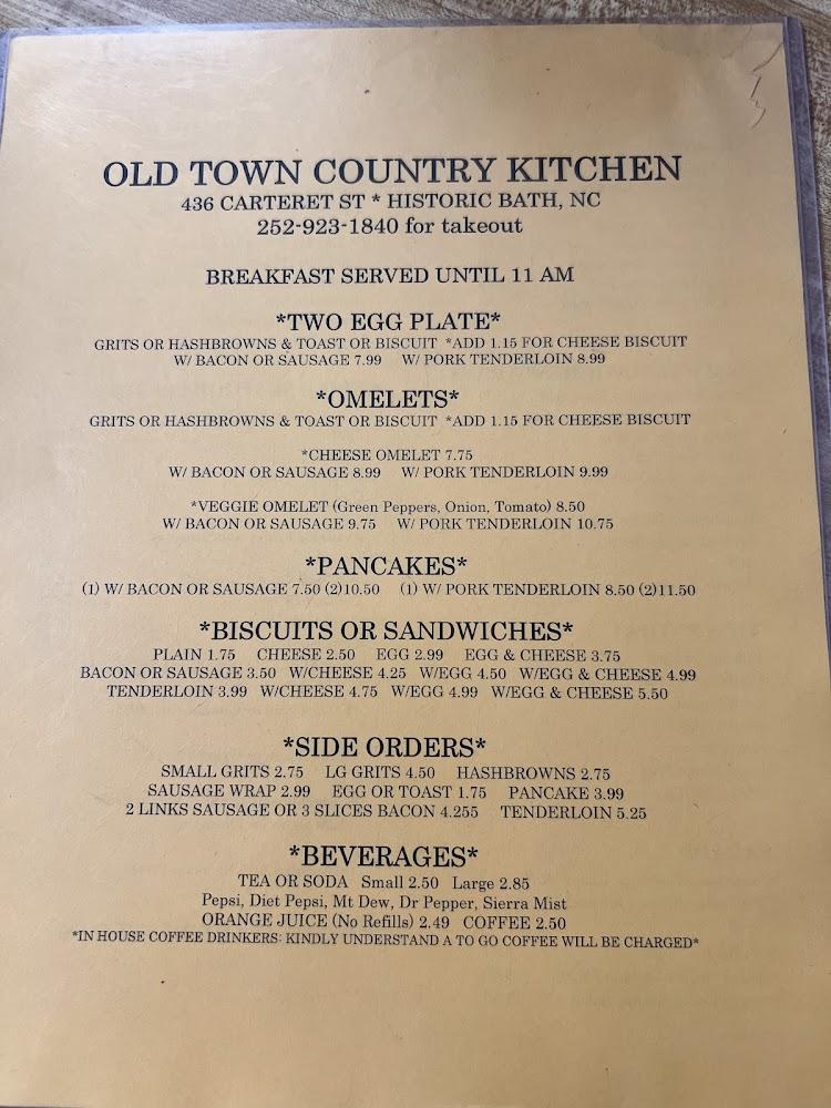 Welcome to Old Town Country Kitchen, a charming American restaurant nestled in the heart of Bath, NC. Our cozy eatery, located at 436 Carteret St, specializes in hearty breakfasts, delightful lunches, and comforting dinners, all served in a relaxed ambiance. Enjoy our excellent coffee, delectable desserts, and a wide selection of teas, featuring local specialties. With options for takeout, dine-in, and delivery, we cater to all your needs, whether you're solo or with a group. Our accessible facilities ensure all guests can enjoy the experience. Join us for a meal that feels like home! Call +1 252-923-1840 to reserve your table today.