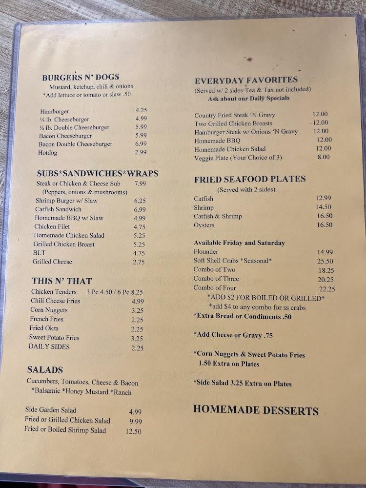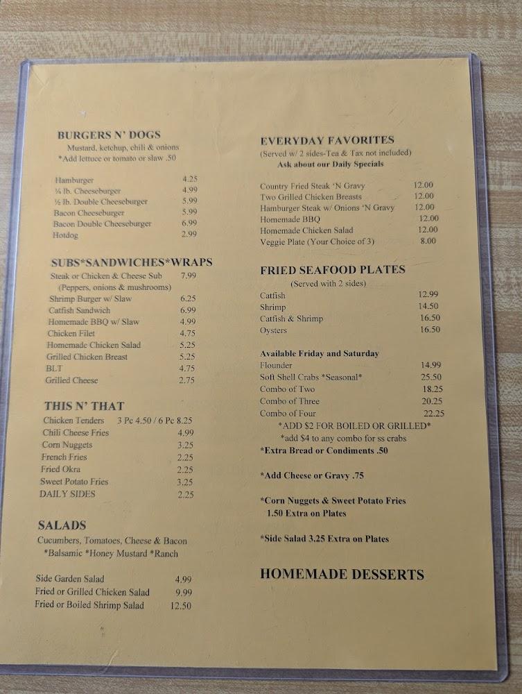 Dinner features fried seafood and country favorites, reflecting local tastes. The dessert list tempts with varieties like 7-layer chocolate cake and butter pecan. Prices range from $10 to $20, making it budget-friendly. This blend of hearty meals and sweet endings creates a satisfying experience for all diners.